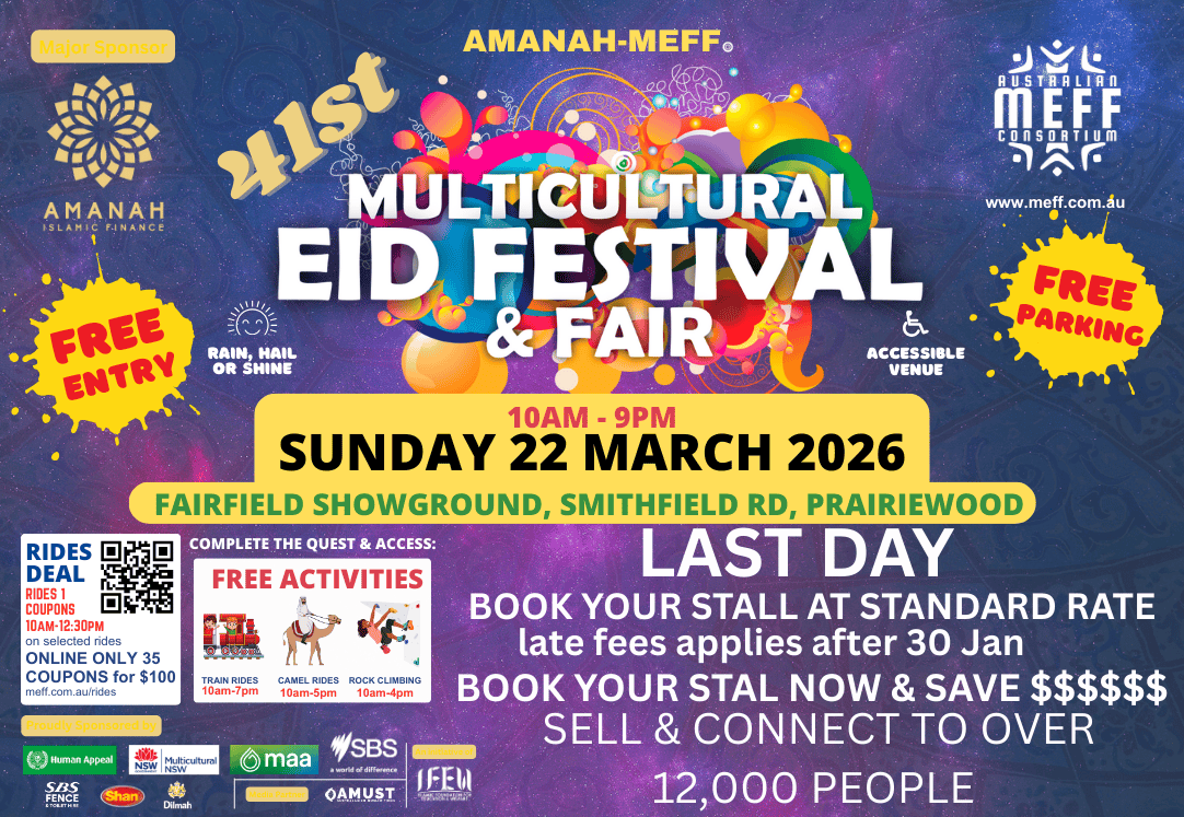 Connect your business to the broader multicultural community at the Multicultural Eid Festival & Fair on Sunday 22 March 2026 at Fairfield Showground, Smithfield Rd, Prairiewood NSW.